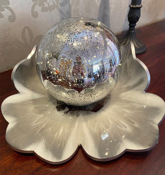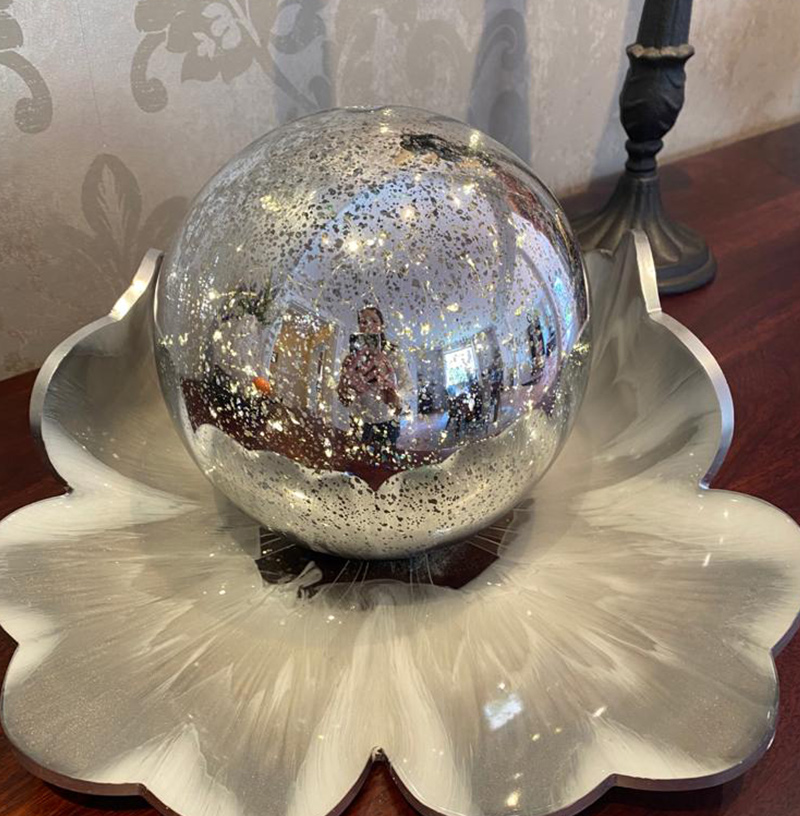 Das Glitzern der Silberkugel und die Reflektionen, die sich in der hochglänzenden Oberfläche der Blüte widerspiegeln, verleihen dieser Kreation einen ganz besonderen Charm.