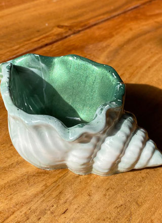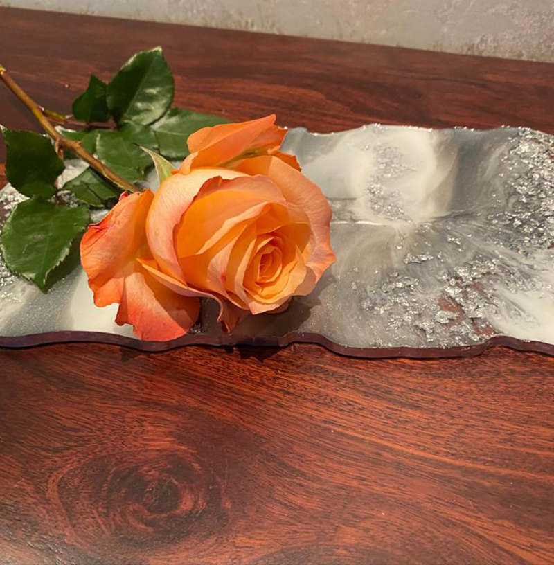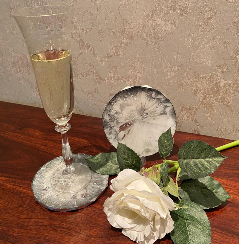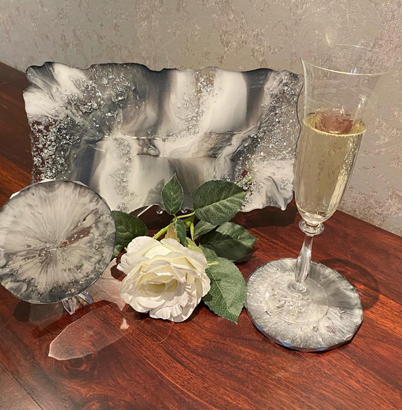 Kunstharz läßt sich in allen erdenklichen Formen und Farben gestalten. Die glänzende und glasartige Oberfläche, die beim Gießen entsteht, ist nach ca. vierwöchiger kompletter Aushärtung bis ca. 80 Grad Celsius hitzebeständig und lebensmittelecht.