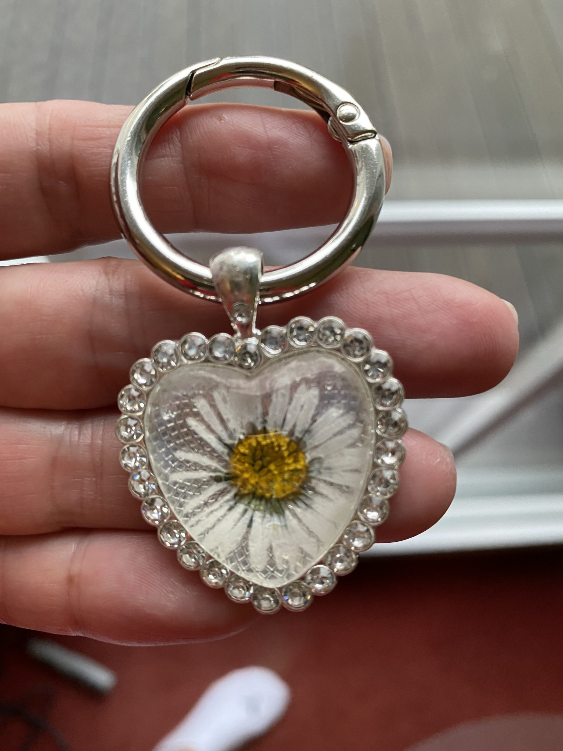 In diesen herzförmigen Schlüsselanhänger habe ich ein getrocknetes Gänseblümchen eingearbeitet.