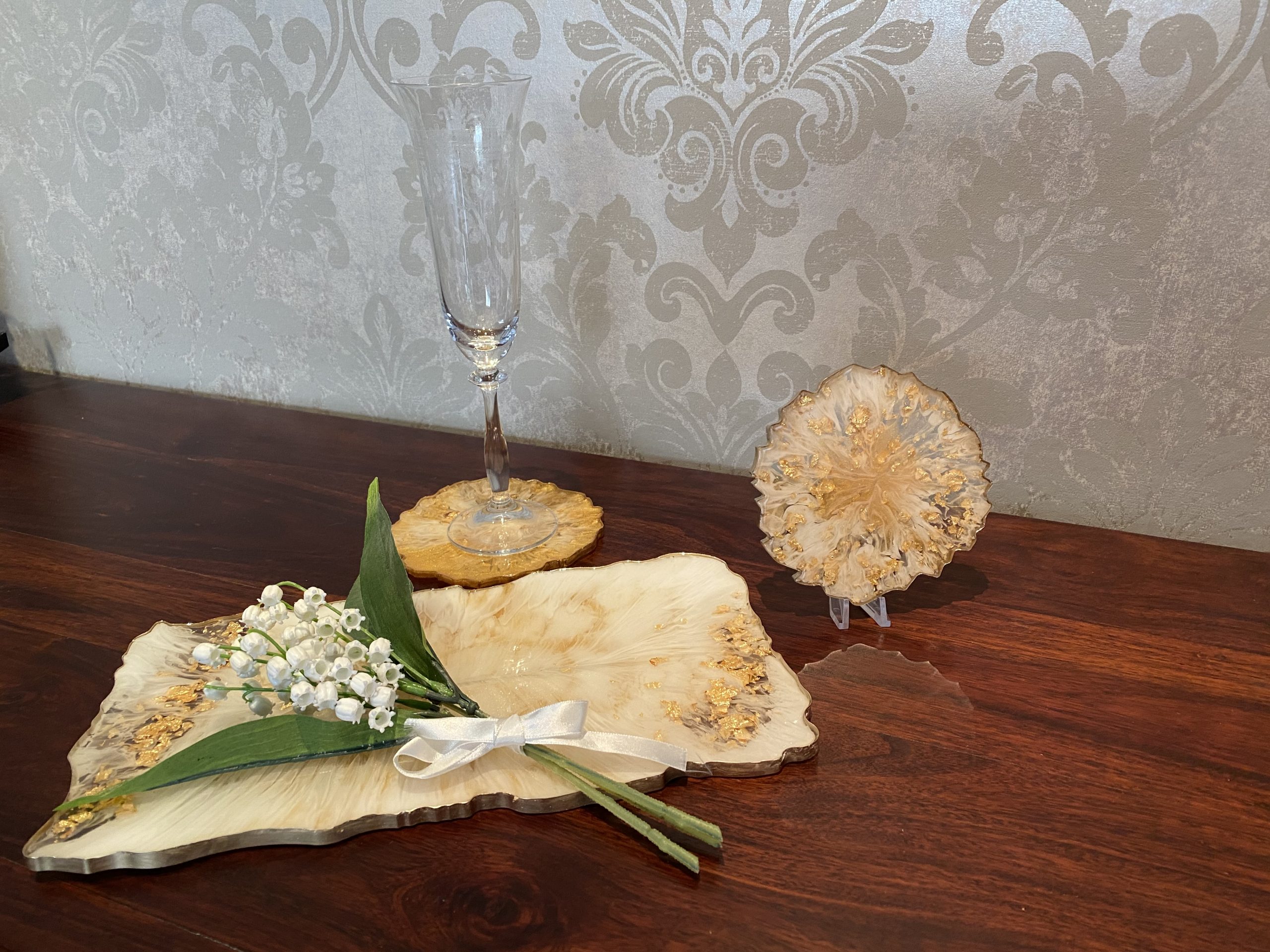 Die dazu passenden Untersetzer mit Goldrand haben einen Durchmesser von ca. 12 cm.