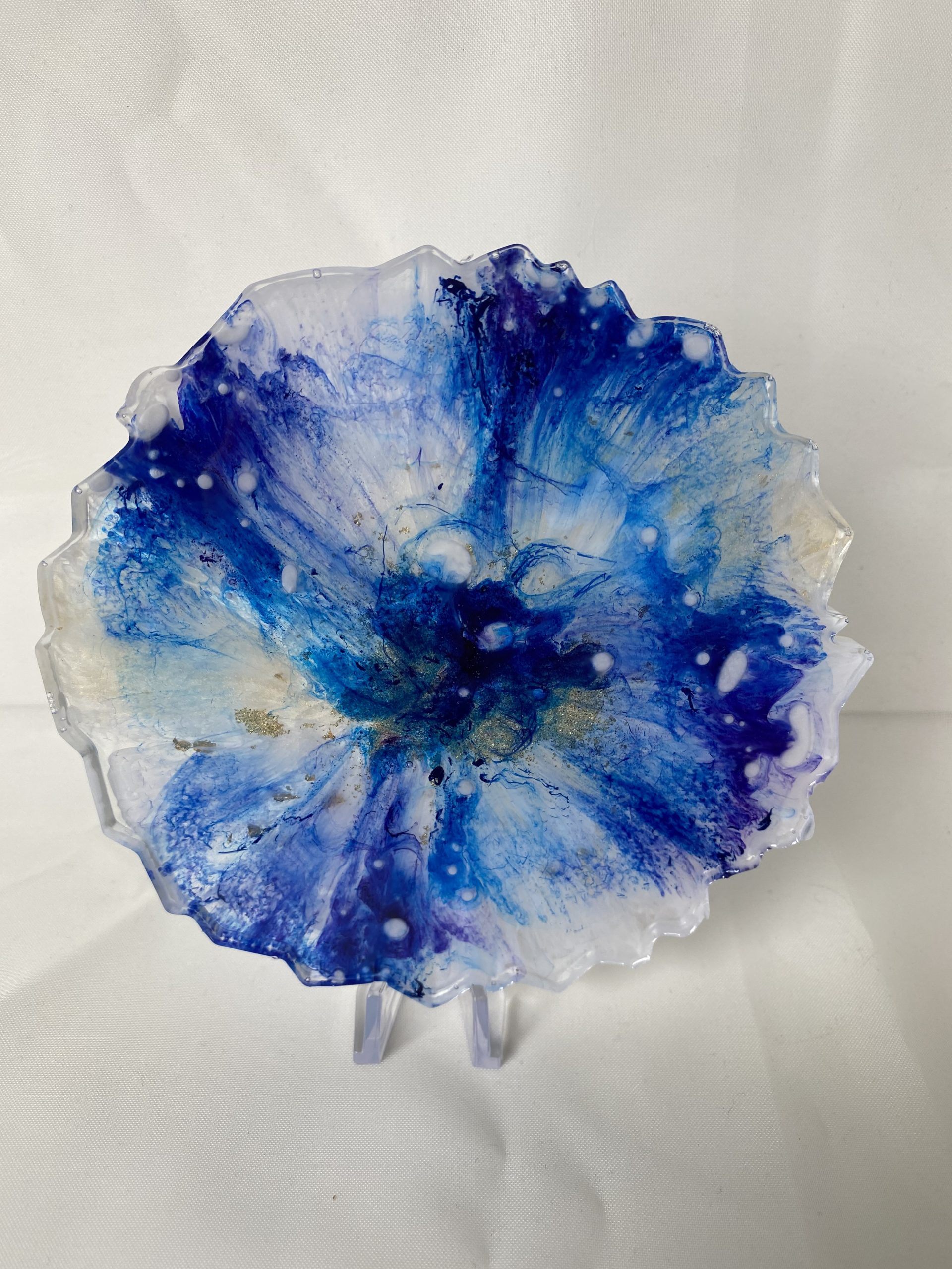 Diesen außergewöhnlichen Untersetzer habe ich mit der Petri-Ink-Technik gefertigt. Hierbei werden die Farben in das klare Harz eingearbeitet.
