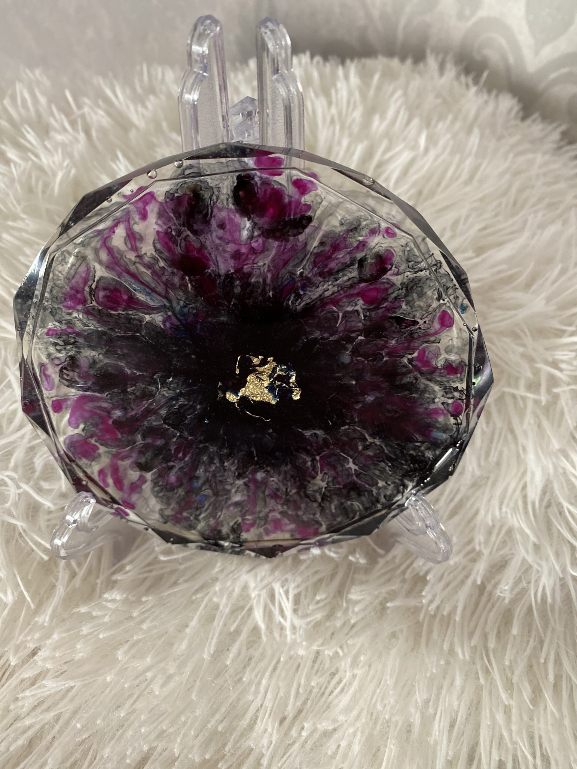 Diesen Untersetzer  habe ich mit der Petri-Inktechnik hergestellt.Diese außergewöhnliche Farbkombination war ein Experiment, was doch überraschend war. In der Mitte ist Blattgold verarbeitet.
