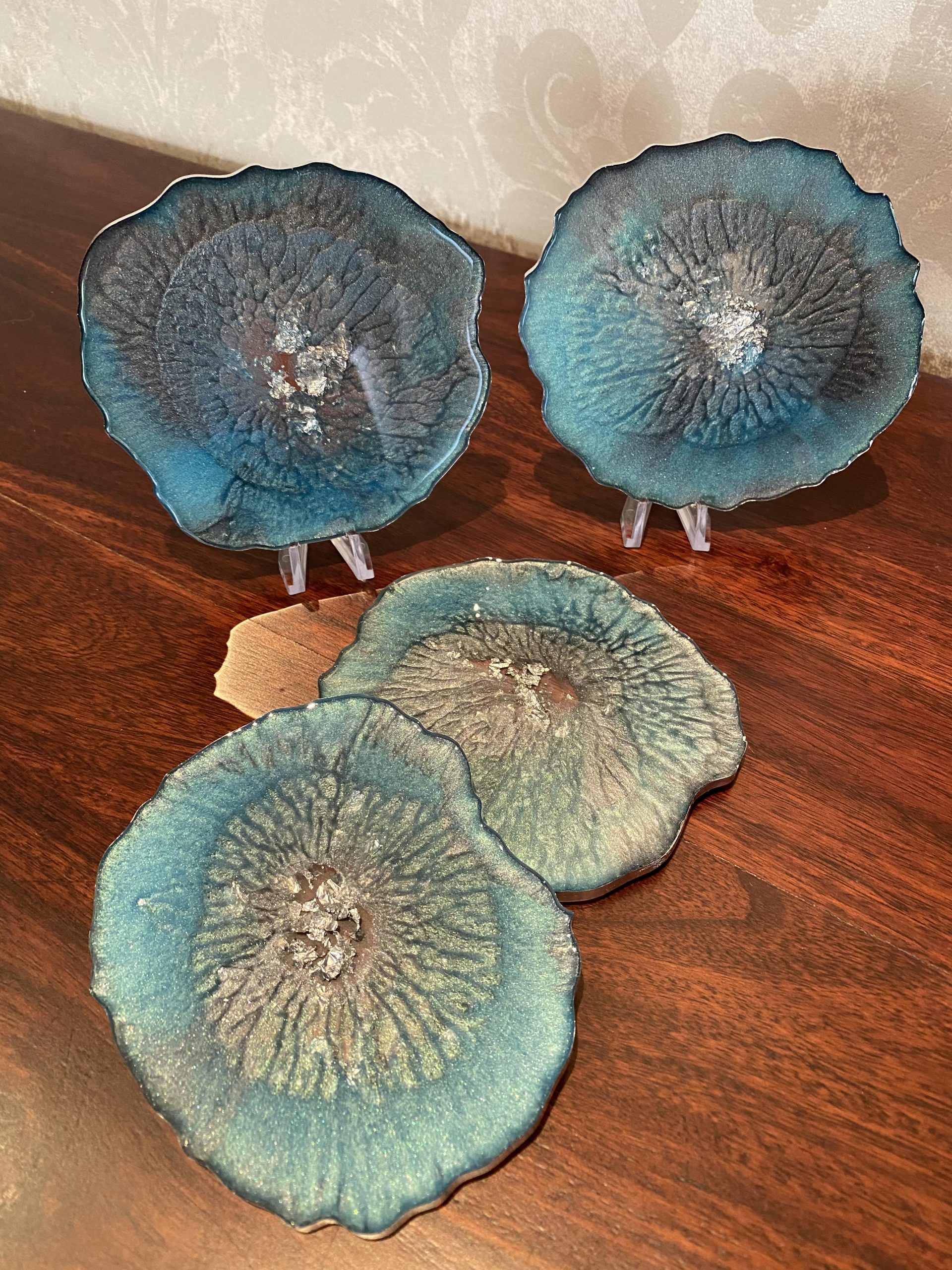Diese Untersetzer in den Farben Türkis-Grau-Silber haben eine Geodenform.